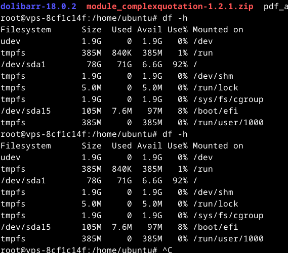 actuellement /dev/sda1 78G 71G 6.6G 92% /